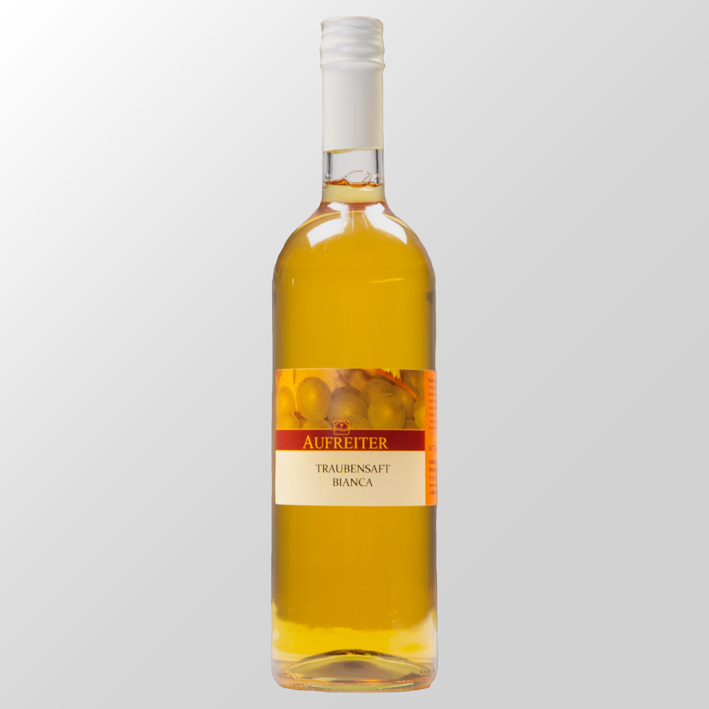 100% purer Saft aus handverlesenen, sonnengereiften Trauben der Sorte „Bianca“, ohne Zuckerzusatz, pasteurisiert.